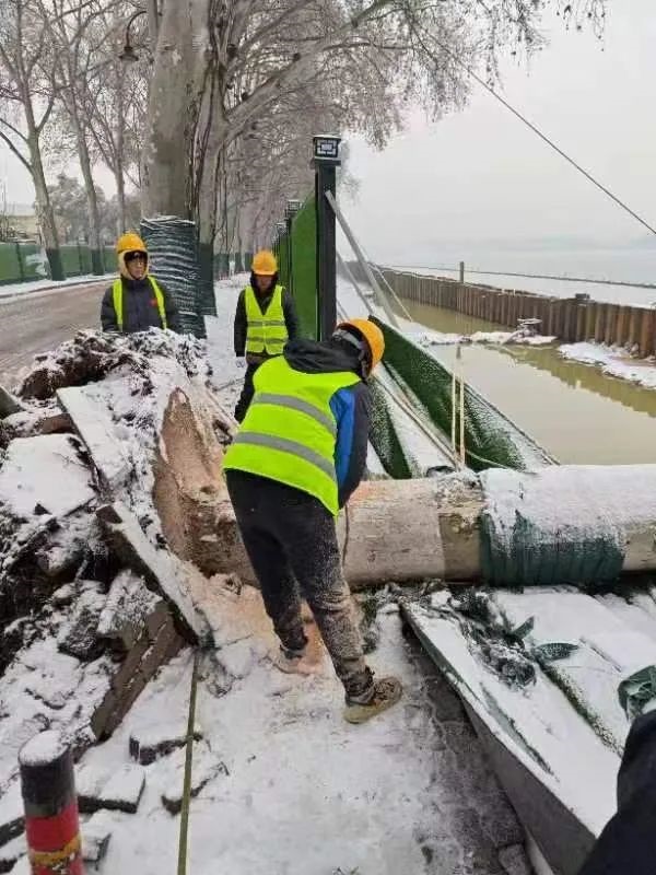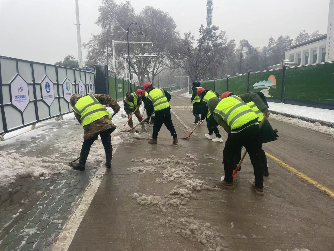 ? ? ? ?2月4日04時10分,武漢市氣象臺發(fā)布暴雪黃色預(yù)警信號。東湖綠道三期項目位于東湖南路,雙向兩車道,毗鄰東湖,道路臨水、彎多、路窄,一旦結(jié)冰行車時危險性極高。清晨6點半不到,項目部突擊隊員們在武漢大學凌波門集合,投入到緊張的鏟雪除冰行動。經(jīng)過近6個小時的與雪“共舞”,東湖南路凌波門附近積雪和厚冰被突擊隊一掃而凈。截至5日下午15時,為放鷹臺段人行通道420米、東湖南路3公里掃雪除冰,清理倒伏法桐一棵、沿線因雪壓落樹枝全部清理完畢,道路無結(jié)冰且通行狀態(tài)良好。
